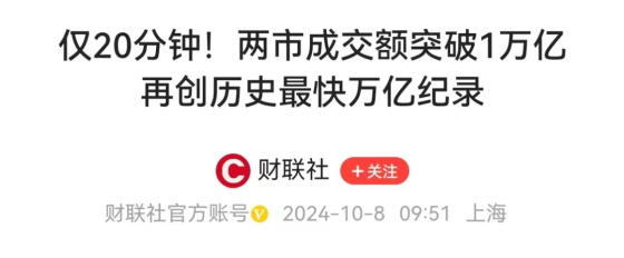 10月8日,据财联社报道,开盘后仅20分钟,沪深两市成交额突破1万亿元,较昨日此时放量超2600亿元,刷新此前9月30日创下的历史最快万亿纪录。
