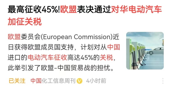 10月4日,欧盟委员会发表声明称,对中国电动汽车加征最终关税的提议,已获得欧盟成员国的“必要支持”,其中10个国家支持加征关税,但包括德国和匈牙利在内的5个国家投了反对票,12个国家弃权。