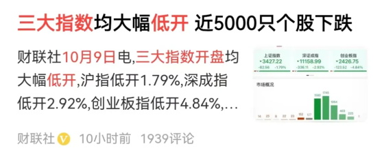 当然,最新情况我也看见了,10月9日,一早开盘A股三大指数开盘,均大幅低开,沪深京三市个股近5000只下跌“A股开盘近5000只个股下跌”。