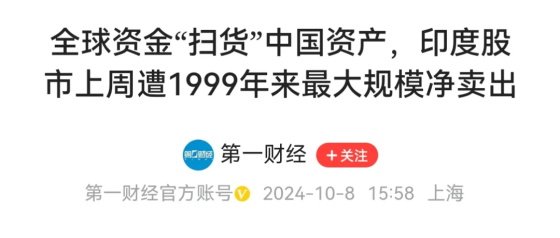 就在这几天,我举个例子,印度那边出现了1999年来最大规模净卖出,惨遭抛售。然后钱往哪里走呢?根据第一财经报道,一名资深华尔街投行人士对第一财经记者表示,“印度、美国等市场均存在泡沫破灭的风险,而中国资本市场被严重低估,因而在中国最近一系列政策的影响下,中国资产虹吸效应正在加速,印度市场上的大笔资金都流入中国资产。”