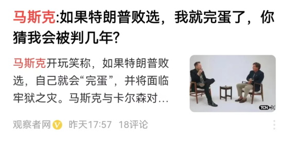 我就这么跟大家说,我看马斯克在访谈节目里和主持人聊天,他自己直接就说了,如果这一次特朗普不上台的话,民主党肯定要把他搞到牢里去,就等着被大清洗吧,所以他真的是赌上了自己的全部身家命运。