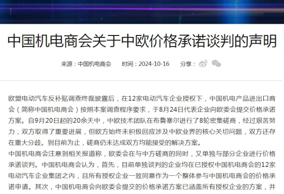 就在10月16日,中国机电商会发了个关于中欧价格承诺谈判的声明。
