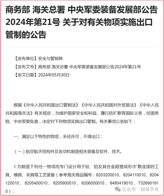他们这一对话不要紧,蛋总突然想起来一件事,那就是今年5月30日,商务部、海关总署、中央军委装备发展部发布公告,对有关物项实施出口管制。