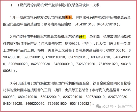 蛋总的理解,制造叶片、导向器、机匣的设备、工具、软件和技术,以及上述相关产品的成品半成品甚至原材料,都被我们禁了。