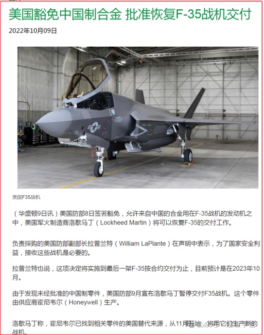 2022年美国工业大摸底的过程中,有个很尴尬的发现,那就是已经生产和交付的所有F35战机中,都有来自中国的零部件,其中包括一种磁铁,不豁免就无法生产交付。