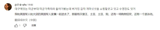 “我曾经跟随美军家属进入过位于大邱的美军基地,在那里吃到了汉堡薯条,汉堡薯条真好吃啊,还有购物中心和游泳池,简直快活得不像是个军事基地。”