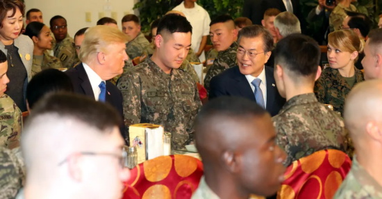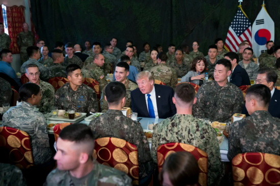 说到汉弗莱营美军餐厅的伙食质量,有一个特别有名的例子。2017年11月,川普在访问韩国期间曾经特意来到汉弗莱营视察,韩国政府原本已经计划好要为川普提供一顿“丰盛的午餐”了,但建国同志拒绝了,他选择在汉弗莱营的美军食堂和一群驻韩美军以及附编韩军共用午餐。