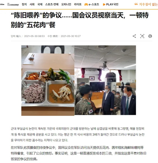 在李彩益把他们这帮韩国议员去部队吃的午饭的照片发到了Facebook上之后,大量韩国网民都跑过来吐槽,说这是因为来领导了韩军官兵才能跟着沾光的特供餐,平时根本就吃不上,与其说是给人吃的,倒不如说是拿来作秀的。