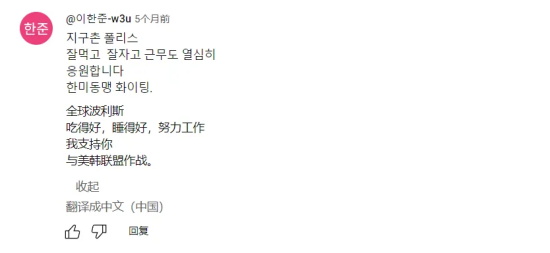 “这就是地球村警察的伙食标准啊!吃得好、睡得好,认真工作,支持美韩同盟,加油!”