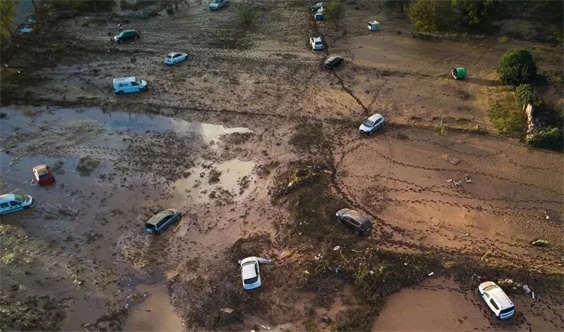 街道上,堆满了被洪水冲走的汽车!