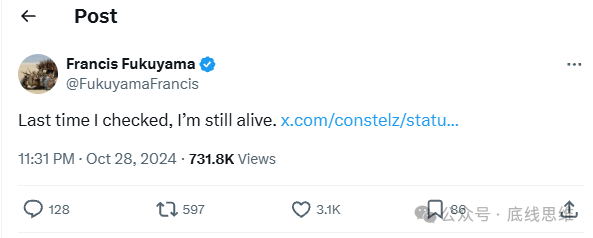 从昨天上午(10月28日)11:09到11:14,我一度以为弗朗西斯·福山(Francis Fukuyama)已经去世。当一个看似与斯坦福大学关联的X账户宣布这位传奇政治学家去世的消息时,很多人都信以为真。令人懊恼的是,我也是其中之一。然后,该账户宣布这是意大利恶作剧大师托马索·德贝内德蒂(Tommaso Debenedetti)的一场骗局。几分钟后,福山本人在X上发帖:“上次检查时,我发现自己还活着。”