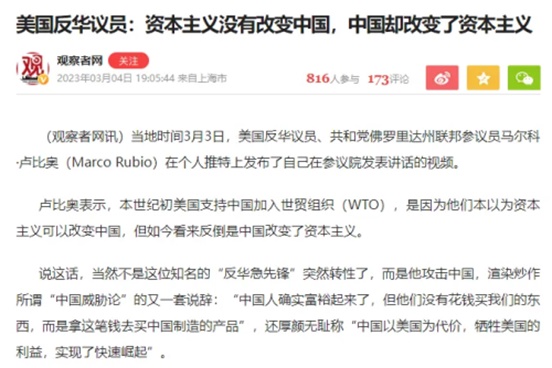 2024年8月2日,被中国多次制裁的极端反华鹰派,共和党参议员卢比奥在社交平台上赞同并再次强调了“不是资本主义改变了中国,而是中国改变了资本主义”这一观点。