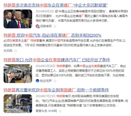 2024年3月至8月,特朗普多次在采访时公开提出对中国汽车制造商在美国生产汽车持开放态度,以此作为提振美国经济的一种方式,特朗普的原话是: