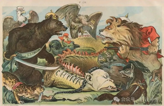 拿刀的黑熊是俄国,拿枪的狮子是英国,飞在空中的鹰是德国,下面的公鸡是法国,狮子胸前的双头鹰是奥匈帝国。