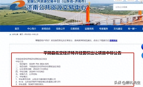 日前,山东济南平阴县发布了一份公告,公开出让低空经济30年特许经营权,总价为9.24亿元。