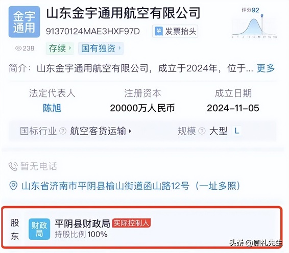 公告显示,中标企业为山东金宇通用航空有限公司,这家公司于今年的11月5日刚刚成立,注册资本2亿元,当地财政局是唯一股东。