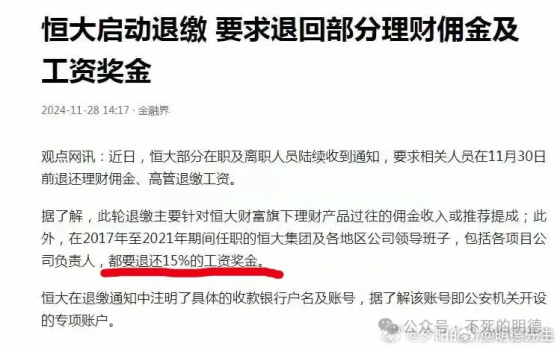 因为恒大财富底层的员工,生活也都不容易,尤其是经过三年疫情,这些被要求退款的恒大财富基层员工中,有些自身都投了恒大财富,钱,还在里面烂着——而恒大给出的解释是,先把100%绩效退回来,然后慢慢等公司退钱。
