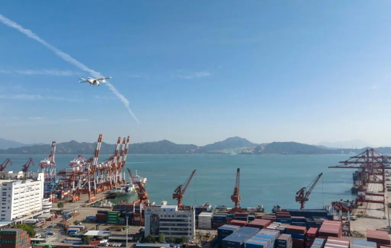 一架无人机搭载着快件从珠海飞抵深圳蛇口集装箱码头附近的起降点。图片来源:新华社