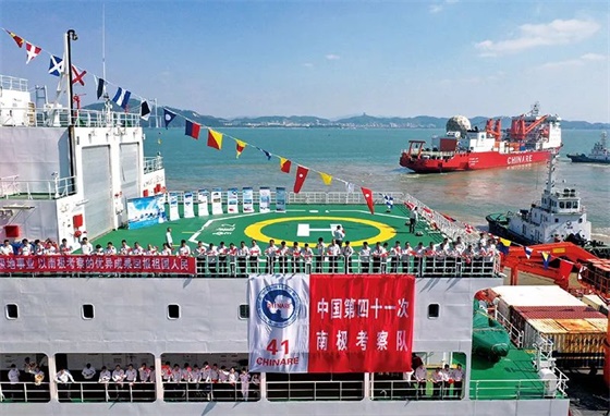 2024年11月1日,由自然资源部组织的中国第41次南极考察队,劈波向南、破浪出征,开启为期近7个月的科考征程。此次考察将开展南极秦岭站配套设施设备建设,围绕气候变化对南极生态系统的影响与反馈开展调查,广泛开展科研和后勤保障领域的国际合作。图为当日,“雪龙”号和“雪龙2”号船从广州南沙国际邮轮母港码头出发(无人机照片)。 新华社记者 黄国保/摄