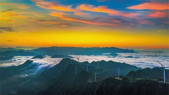 近年来,各地围绕资源优势加速布局清洁能源产业,持续加快风能、光能、氢能等新能源产业建设,为高质量发展提供新动能。图为2024年10月10日,重庆市万盛经济技术开发区石林镇,风电机组耸立在青山之巅,缭绕的云雾与满天的朝霞相映成景。 自然资源部供图 曹永龙/摄