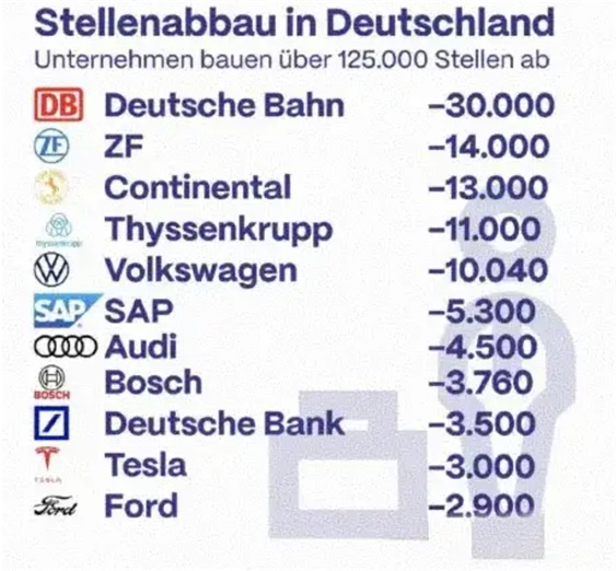 不只是大众,德国所有的汽车相关工业都在“雪崩”,采埃孚裁员9800人,博世全球裁员5500人,舍弗勒裁员4700人,蒂森克虏伯钢铁裁员11000人……他们当年碾压世界的产业,彻底玩不转了,汽车是个长产业链,德国汽车产业直接雇佣约79万人,间接创造了数百万个就业岗位,大众BBA不行了,这条长长的产业链也会挂掉。