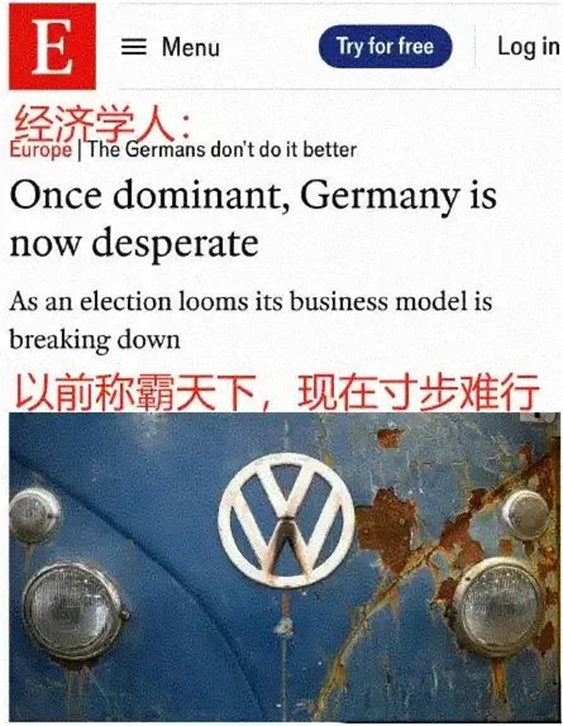 德国人依赖的精密制造、汽车、化工等高附加值工业,在新能源的冲击下,已经是日薄西山。而新的机器人、无人机、自动驾驶、AI等产业,他们更是全面落后,而且根本没有发芽的迹象。