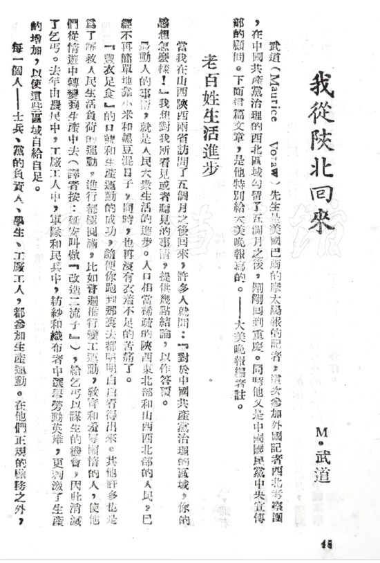 当初他被国民党选进“中外记者西北参观团”的时候,国民党本意是想掺沙子,自己聘的顾问,那肯定得替自己说话,怎么埋汰中共怎么写,结果没承想这个武道竟然没按套路出牌,至于他写了什么,看看下面这张照片就知道了。