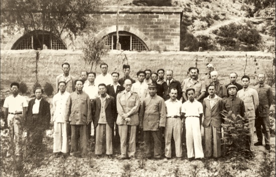 在延安枣园,教员接见来访记者团中的六位外国记者。后排右起:教员、斯坦因、夏南汗;前排右起:福尔曼、爱泼斯坦、普金科、武道——黄浣碧供图
