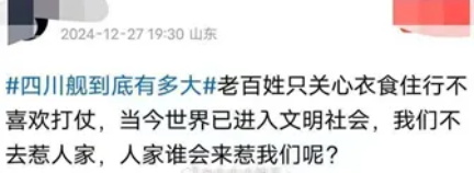 例如,在#四川舰到底有多大#的话题下,有殖人说,“老百姓只关心衣食住行,不喜欢打仗,当今世界已进入文明社会,我们不去惹人家,人家谁会来惹我们呢?”乍听之下,有点似是而非吧,但要是顺着他们的逻辑,我们的四川舰就纯属浪费钱了,只要我们是“文明”的,只要“我们不去惹人家”,就没人会来惹我们,反之,如果哪天别人来惹我们了,要么是我们不“文明”,又或者我们去“惹人家”了,这才是他们想说,而不敢说的潜台词。