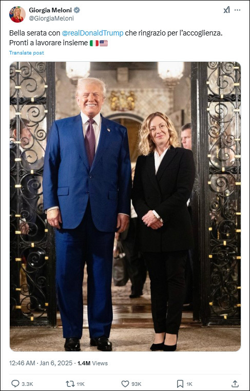 梅洛尼在社交媒体X上发文称,已准备好与特朗普开展合作