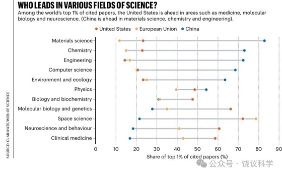 中国在生物和生物化学、分子生物学和遗传学、空间科学、神经科学、临床医学等方面的高引用率文章少于美国。
