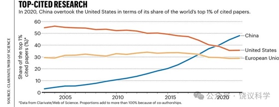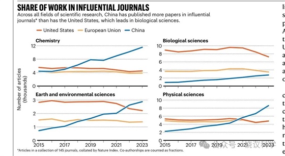 中国在材料、化学、工程、计算机、环境和物理的高引用率文章超过美国。