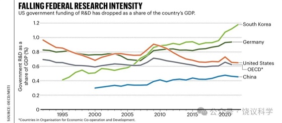 中国政府投入研发经费占GDP约0.4%,美国0.6%。