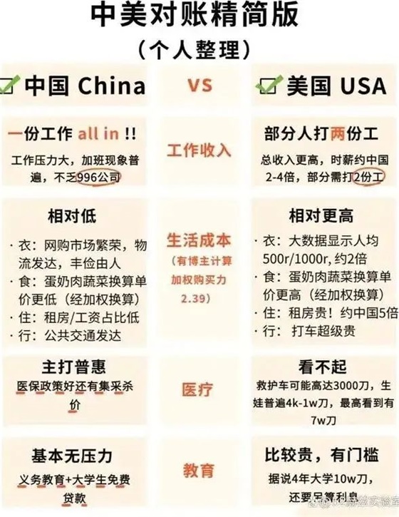微博账号“迎十里”有一大段评论说得特别好,我引用过来分享给大家,他说,这一波小红书中美“对账”让中国的年轻人陡然发现一个真相:原来个人收入并不是决定生活幸福的唯一标准,比如: