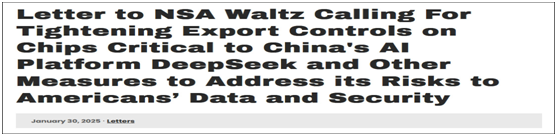1、1月27日美国国会众议院“美中战略竞争特别委员会”主席、密歇根州共和党籍众议员约翰·莫莱纳尔(John Moolenaar)发布声明,妄称DeepSeek等中国AI模型“威胁美国国家安全”,鼓吹对“AI基础设施的关键技术”实施更严格的出口管制。
