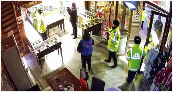 现场监控视频显示,剪断店铺门锁的是几名身穿消防员制服的工作人员。门被打开后,先后有7人进入店铺内,其中有3名身穿荧光绿制服的工作人员,衣服背后印有“平城综合执法”字样。