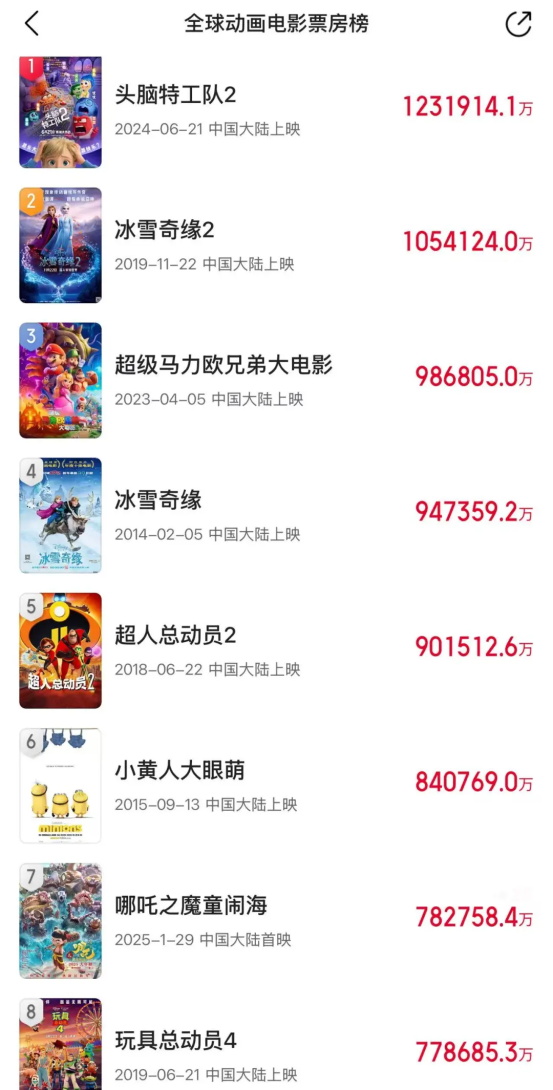 目前,《哪吒2》电影票房已超过《玩具总动员3》和《玩具总动员4》票房成绩,位列全球动画片票房榜第7名,同时也是首部进入全球动画票房榜TOP10的非好莱坞动画电影!