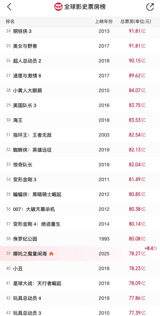 目前,《哪吒2》已进入全球影史票房TOP50、全球动画电影票房榜TOP10,而且相关数据还在不断刷新中。
