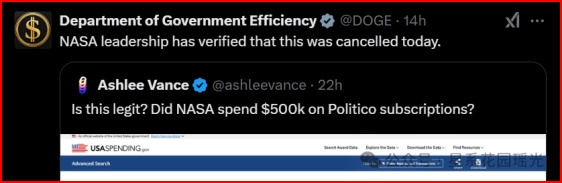 2月6日马斯克还砍掉了美国宇航局NASA的“政确”审核部门(指DEI Political Correctness)。节约了每月50万美元左右的开销。