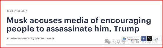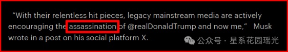 马斯克在其X檄文中写道:“传统主流媒体凭借其无情的热门报道,之前一直积极鼓励暗杀某普,现在,又鼓励人们暗杀我。”