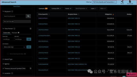 为了证明自己查账认真,马斯克甚至在其列表上公布了该部门给纽约时报的每一笔打款,根据其“新闻报道”对白宫的贡献,每一笔,从7万、9万美元到上百万美元不等……