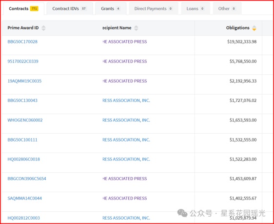 从明细账可以看出,疫情前几个月开始,美联社突然从布林肯所在部门拿到了一大笔钱,之后两年越来越多。但在2025年1月,经费被马斯克砍到几乎没有……