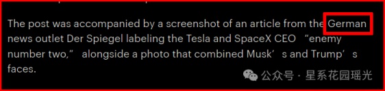 讽刺的是,这篇帖文竟然附上了德国新闻媒体《明镜周刊》的一篇文章的截图,该文章将特斯拉和SpaceX的首席执行官马斯克标记为人类“第二大敌人”,旁边还有一张马斯克和某普合影的照片。