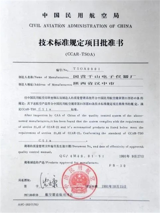 1991年10月16日,中国民航总局首次给国内航空机载电子产品颁发适航证,FJ-30飞参获得国内第一部机载设备适航证书,编号0001。