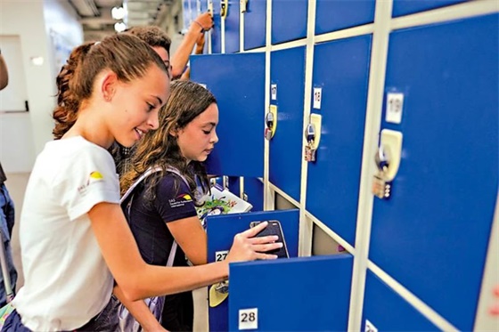 巴西圣保罗一所学校内,学生在课前将手机存放在储物柜中。