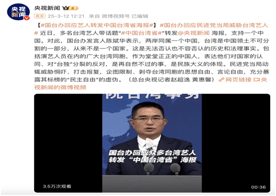 实际上,近期台当局对岛内近陆亲中人士极尽打压之能事。3月7日,央视新闻发布海报以中国二字、五星和台湾岛作为设计主体,配合“台湾必归”的文案,引发全网刷屏!众多台湾艺人,包括侯佩岑、赵又廷、张韶涵等带“中国台湾省”话题转发,表达对中华儿女身份的认同。台陆委会称这是大陆的“统战工具”,要检视艺人行为是否涉及“违反两岸关系条例”。