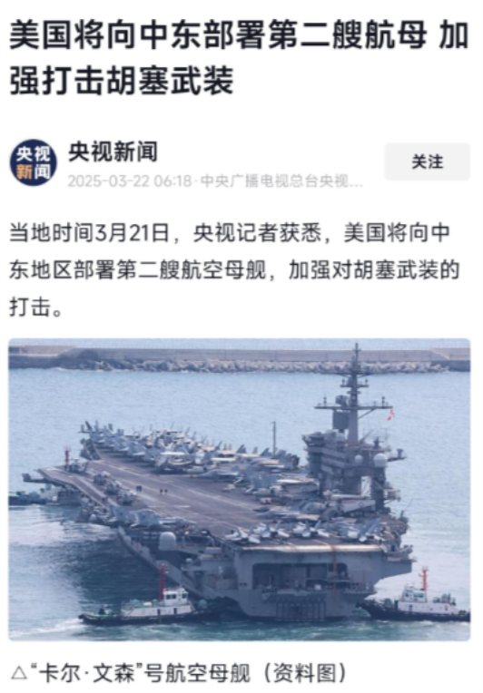 3月15日正式对胡塞发动攻击的时候不增派航母战斗群,都展开攻击6天了突然要增派航母战斗群。
