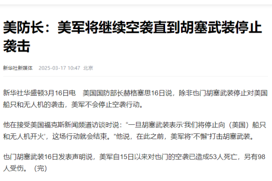 如果胡塞武装连口头停战都不肯给,那美国将继续打击胡塞武装。