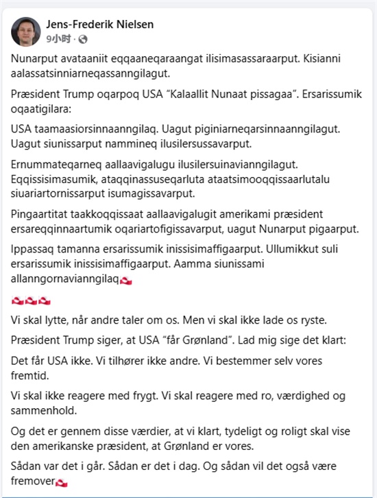 格陵兰岛新总理尼尔森表达了“强烈反对”的决心。他在社交媒体平台脸书上写道:“特朗普总统说,美国‘将得到格陵兰岛’。请允许我明确一下:美国不会得到格陵兰岛。我们不属于其他人。我们自己决定自己的未来。”