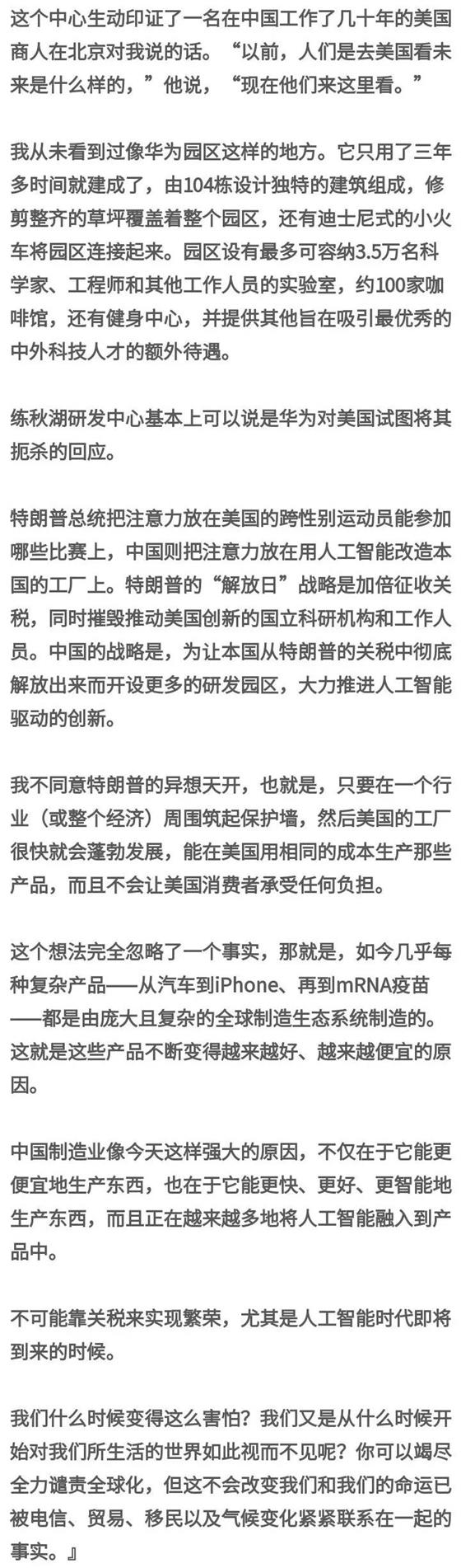 2025年4月3日,美国《纽约时报》网站刊登了知名专栏作家托马斯·弗里德曼的深度观察文章《我看到了未来,它不在美国》。文章以弗里德曼近期访问上海华为青浦练秋湖研发中心的经历为切入点,详细阐述了他对中国科技创新能力的深刻认知,原文摘要如下: